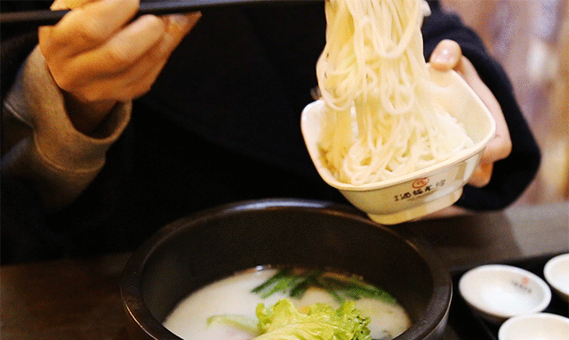 薄切的豬肚和鮮嫩的雞片,先下入仍在沸騰的,已經(jīng)熬制了六個(gè)小時(shí)的豬骨和雞肉的高湯中,鮮味爭(zhēng)先恐后的漫出,唱出一首對(duì)胃的“征服”。再將鵪鶉蛋和其他肉蔬依次倒入,稍加攪拌十秒,吃貨們便可大快朵頤了。